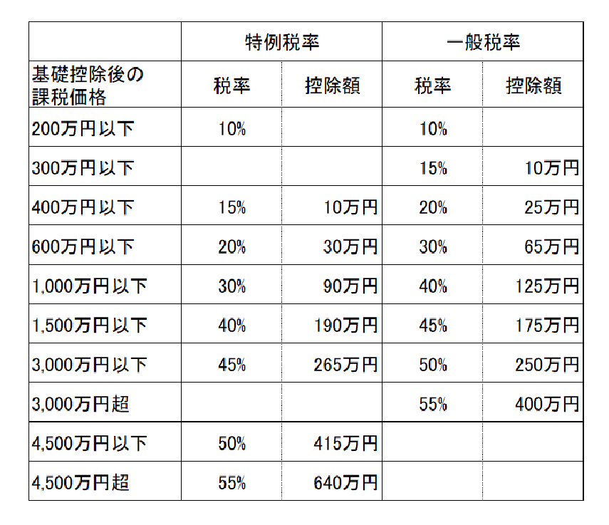 贈与税の税率は2種類あって、特例税率と一般税率があります。特例税率とは、直系尊属(祖父母や父母など)から、その年の1月1日において20歳以上の者(子・孫など)への贈与に適用し、一般税率とはそれ以外の場合(兄弟間の贈与、夫婦間の贈与、親から子への贈与で子が未成年者の場合、他人からの贈与など)に適用されます。