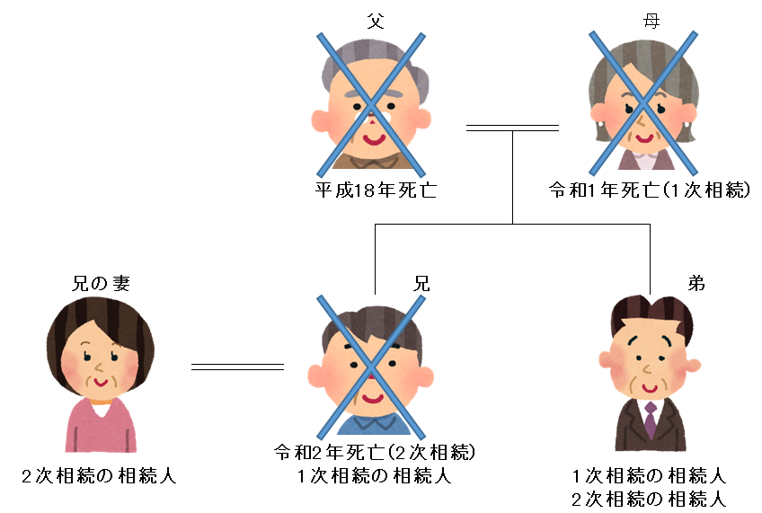 父親が亡くなって、その後母親が亡くなるようなケースが該当するのは分かりやすいと思いますが、母親が亡くなって、その後兄弟が亡くなったというようなケースでは、1次相続の相続人と2次相続の相続人は変わってきます。兄弟の配偶者や子どもは1次相続時に相続を受けていないので、相次相続の要件に該当しません。下記の例だと、弟は相次相続控除の対象になりますが、兄の妻は対象になりません。