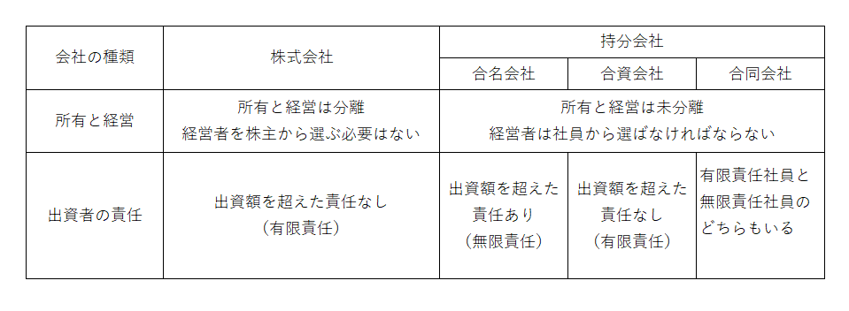持分会社とは、信頼関係を有する少数の者が共同して、比較的小規模な営業をする場合に適しています。持分会社の3種類の違いは、出資者が負う責任が、合同会社の出資者は有限責任・合名会社の出資者は無限責任・合資会社の出資者には有限責任と無限責任があるということです。有限責任とは、会社が倒産した時、出資金の範囲内で連帯責任を負い、無限責任とは、会社が倒産した時、会社に対して無限の責任を負い、自己の財産を弁済に充てる必要があります。意外なところでは、アマゾンジャパン・アップルジャパン・西友等は合同会社です。